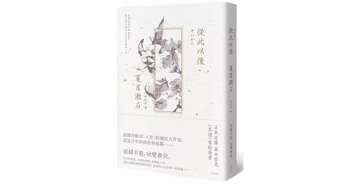 《從此以後》乃是夏目漱石前期三部曲中的第二部,1909年開始於《朝日新聞》上連載。前承《三四郎》後啟《門》。一部本該是熾熱禁忌的通姦文學,在大文豪縝密的計算之下,通篇語句質樸平白,情感內斂而古典,以物件與花朵隱喻人物內心與互動,雖不見情慾卻曖昧萬分。在明治政府高唱「富國強兵」的權威時代下,非但未受到道德人士的譴責,反而深受讀者喜愛。