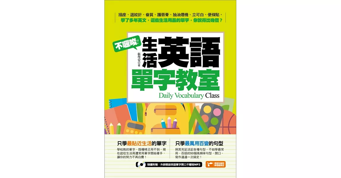 在學了那麼多年英文、為了考試熟記上千上萬個單字以後,你覺得自己已經能在日常生活中好好運用英文了嗎?才怪,學校教的,至少50%都是偏離生活的艱澀單字,連真正的老外都很少使用……既然如此,不如從週遭開始著手,學習插座(outlet)、長尾夾(binder clip)、標籤貼紙(sticky label)、立可白(white-out)等等真正用得到的英文,比較實際吧!