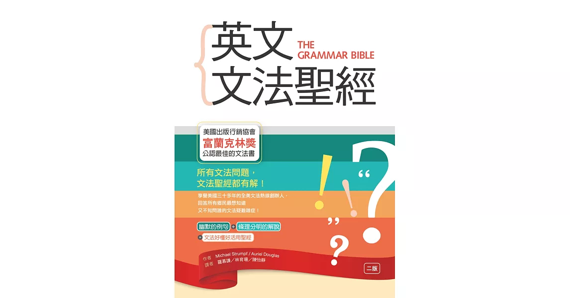 ☆非常棒的文法書籍!沒有什麼文法問題是作者覺得簡單到沒啥好問的,他回答問題很有條理,清楚具體,內容好吸收,一聽就懂,讀起來很有趣。──讀者Rachel B.