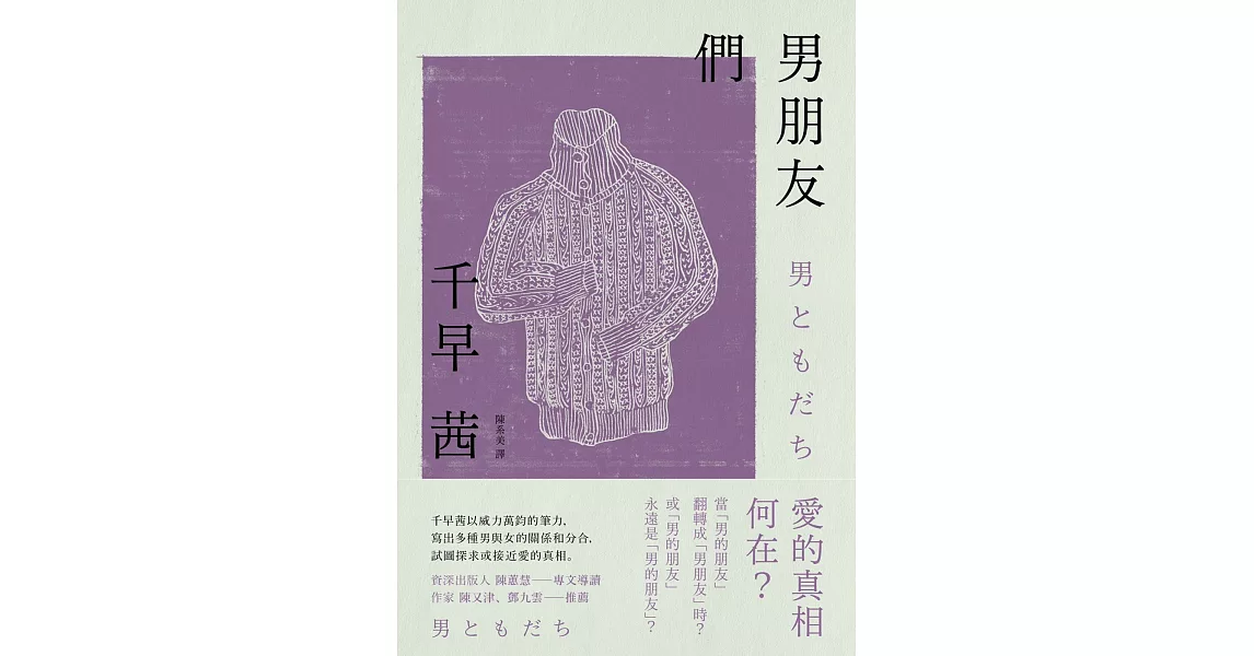 商品描述: 書名:男朋友們,原文名稱:男ともだち,語言:繁體中文,ISBN:9789869388320,頁數:320,出版社:青空文化有限公司,作者:千早茜,譯者:陳系美,出版日期:2017/03/24,類別:文學小說