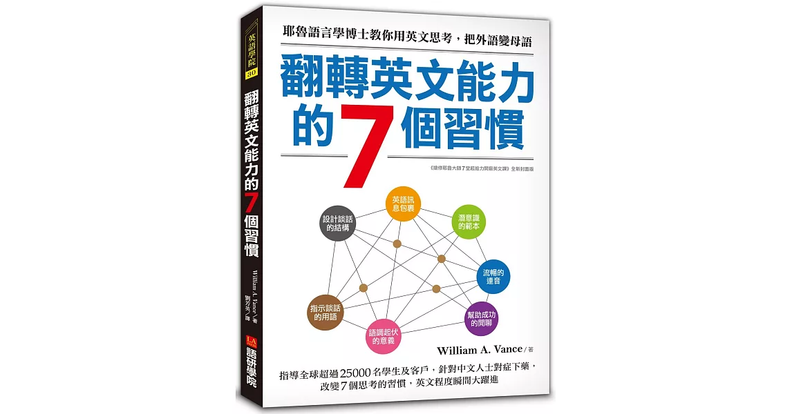 商品描述: 書名:翻轉英文能力的7個習慣:耶魯大學語言學博士教你用英文思考,把外語變母語,原文名稱:ドクター・ヴァンスの英語で考えるスピーキング: すらすら話すための7つの思考法,語言:繁體中文,ISBN:9789869476843,頁數:240,出版社:語研學院,作者:William A. Vance,譯者:劉芳英,出版日期:2017/09/01,類別:語言學習